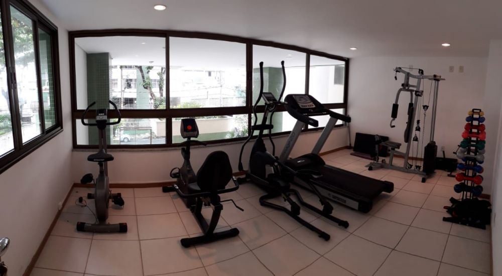Prédio pastilhado com piscina e academia.