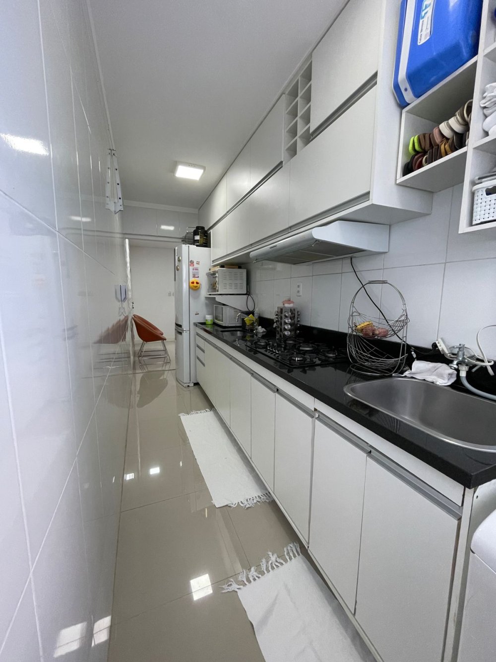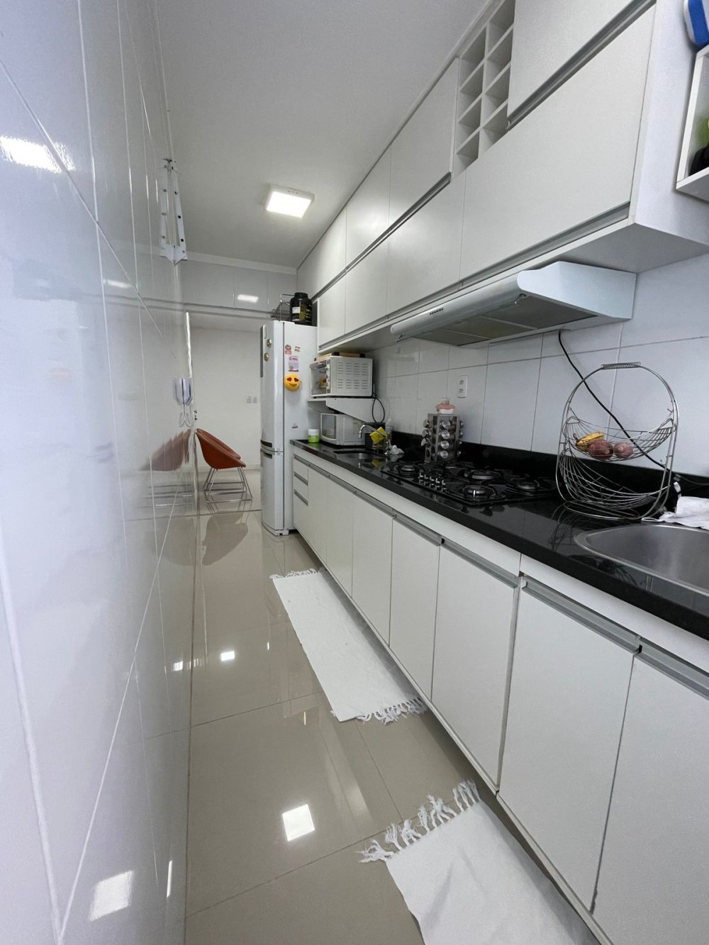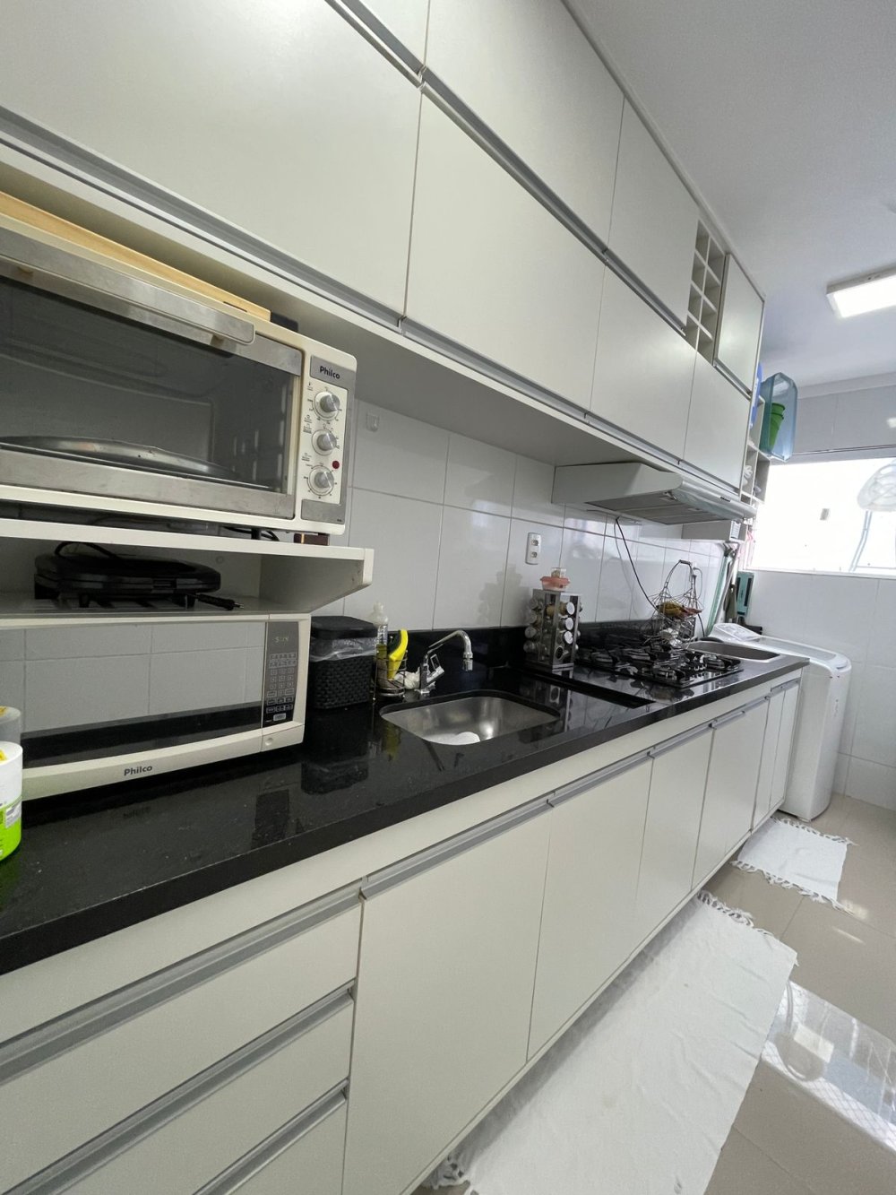 Cozinha modernizada e integrada com área de serviço, fogão cooktop, equipamentos embutidos e bancada em granito.